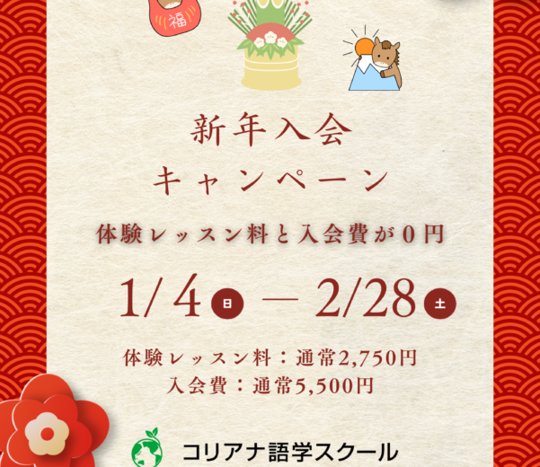 コリアナ語学スクール、貸スペースコリアナは2025年12月29日(月)~2026年1月3日(土)の間、年末年始のお休みを頂戴しております。